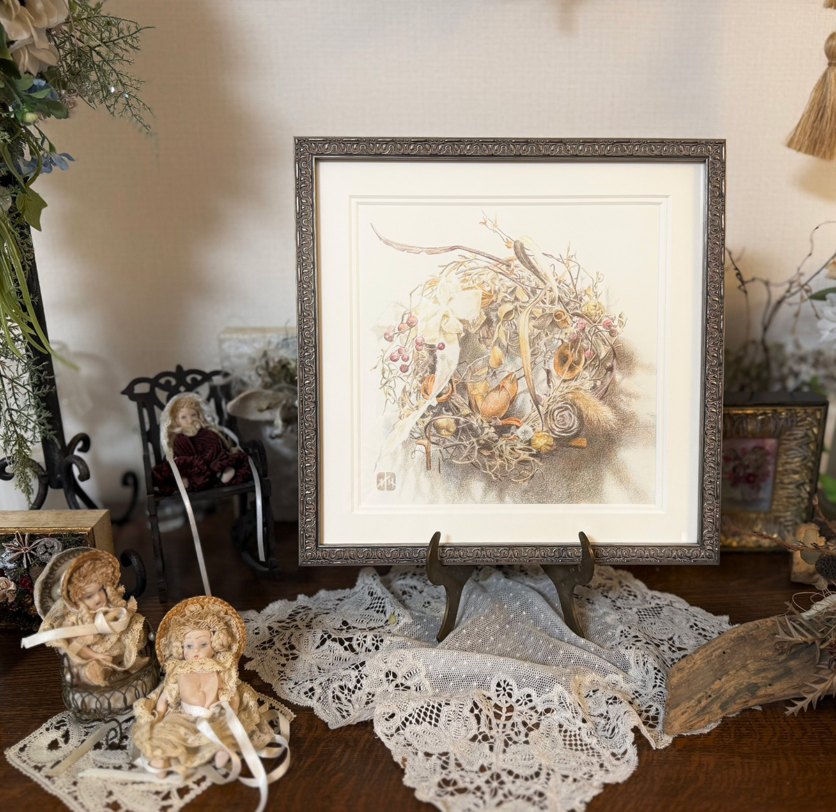 フラワーアーティストの伊藤梢さんのドライフラワーのリースを描かせていただいた作品です。
